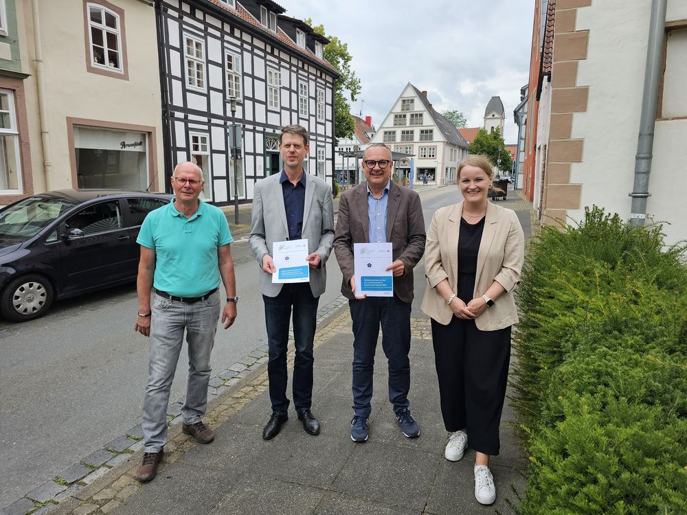 Foto: (von links) Lemgos Radverkehrsbeauftragter Gerhard Reineke, Marcus Heidebrecht (Sachgebietsleitung OWL beim Zukunftsnetz Mobilität NRW), Bürgermeister Markus Baier und Linda Waldeyer (Zukunftsnetz Mobilität NRW).
