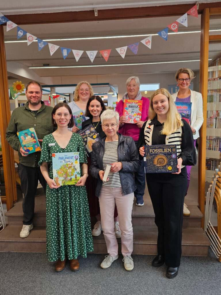 Foto: (obere Reihe von links) Fabian Schröder, Leiter der städtischen Museen, Inga Kunz, Mitinhaberin der Buchhandlung Pegasus, Gina Wattenberg, Stadtwerke Lemgo, Irma Kreimeier von den ehrenamtlichen Vorlesepatinnen und Vorlesepaten der Stadtbücherei, Silvia Herrmann, Leiterin des Weserrenaissance-Museums Schloss Brake, (vordere Reihe von links) Hannah Vehreschild, Stadtbücherei Lemgo, Elisabeth Webel, Förderverein der Stadtbücherei, Ilka Steinmetzler, Sparkasse Lemgo. (Foto: Alte Hansestadt Lemgo)
