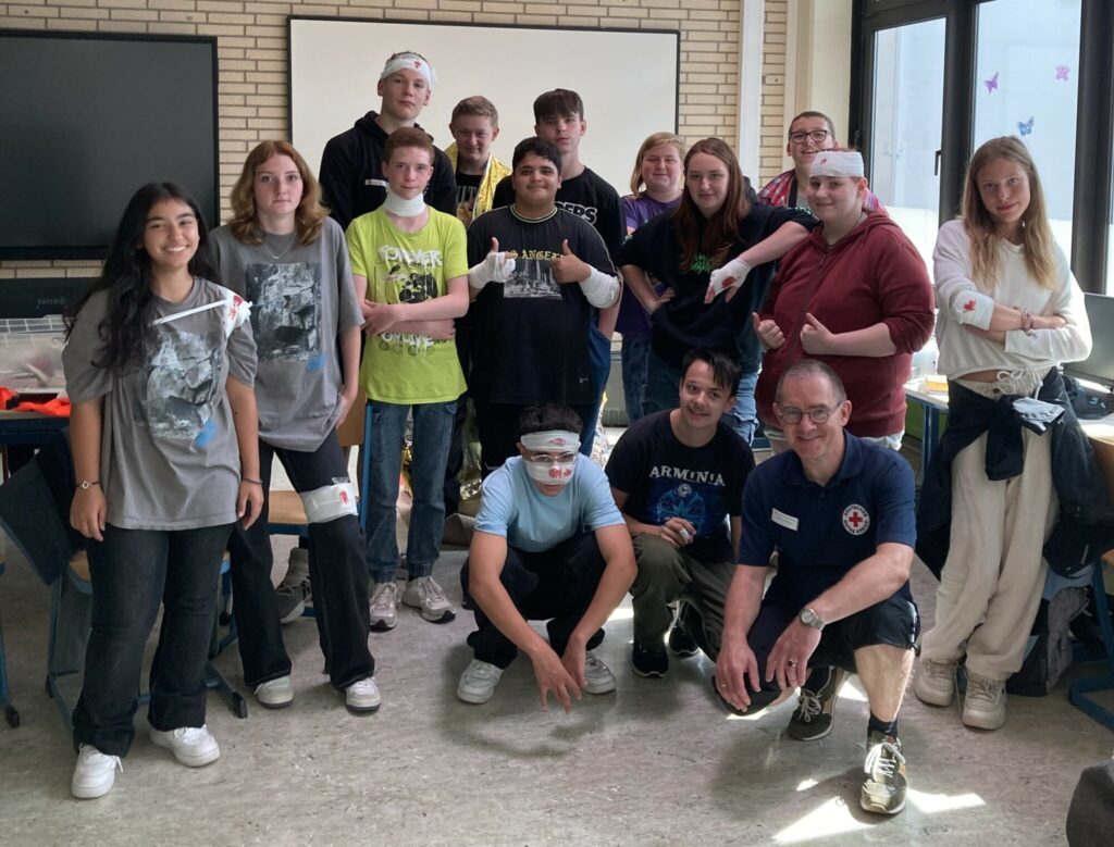 An der Heinrich-Drake-Schule gibt es seit dem 24. August wieder motivierte und aktive Schulsanitäter. Im Rahmen der wöchentlichen AG-Angebote wurden 14 Schüler und Schülerinnen der 8. und 9. Klasse unter der Leitung von Vincent Christen durch den Erste-Hilfe-Ausbilder des DRK Michael Bosse geschult. Alle Schüler haben nach zwei interessanten und auch spaßigen Tagen der Erste-Hilfe-Ausbildung einen Abschluss-Test abgelegt und wirken nun im Schulsanitätsdienst (SSD) mit. Die Schüler und Schülerinnen werden jetzt mindestens für ein Jahr im SSD aktiv tätig sein und bei Unfällen im Schulalltag Erste-Hilfe leisten können.