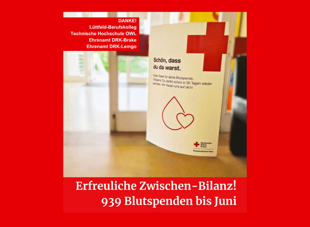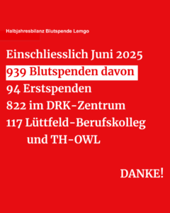 Insgesamt haben 939 Spenderinnen und Spender in Lemgo bis einschließlich Juni 2025 Blut gespendet, davon waren 94 Personen zum ersten Mal dabei. Die Halbjahresbilanz zeigt, dass im DRK-Zentrum Lemgo 822 Menschen zur Spende kamen. Weitere 117 Personen waren sowohl am Lüttfeld Berufskolleg als auch an der Technischen Hochschule OWL für ihre Mitmenschen da. Damit wurden die guten Zahlen aus 2024 übertroffen.