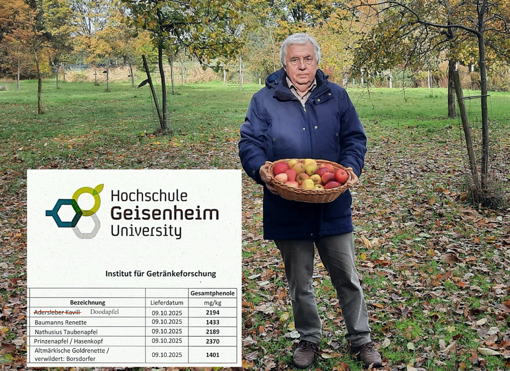 Andreas Schwieger aus Apenburg in Sachsen-Anhalt findet die Informationen vom BUND Lemgo zu Thema Apfelallergie ausgezeichnet. Er bietet Äpfel aus seiner kleinen Obstwiese auf Erntefesten zum Kauf an und informiert dabei die Kunden über verträgliche Apfelsorten für Apfelallergiker auf Basis der Unterlagen vom BUND Lemgo. Nun hat er auf eigene Kosten bei der Hochschule Geisenheim 5 seiner Apfelsorten auf den Gehalt an gusundheitsfördernden Polyphenolen untersuchen lassen. Ein hoher Gehalt bedeutet im Normalfall, dass die Sorte für Apfelallergiker problemlos verträglich ist.