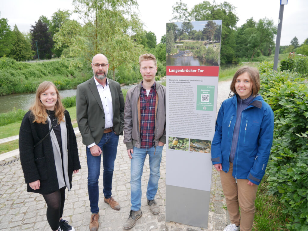 Foto: (von links) Nicole Baeumer, Projektleiterin von digital.interkommunal, Beigeordneter und Kämmerer Frank Limpke, Jörn Bollhöfer, digital.interkommunal, und Klimaschutzbeauftragte Ronja Post an der Station des neuen digitalen Bioptoppfades am Langenbrücker Tor.