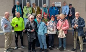 Die 20 Teilnehmer der Fahrt der AWO OV Lemgo e.V. nach Bad Salzuflen vor dem Puschen-Museum in Wülfer-Bexten, der ehemaligen Schuhmanufaktur von Klaus Süllwald, die bis zur Corona-Pandemie aktiv war.