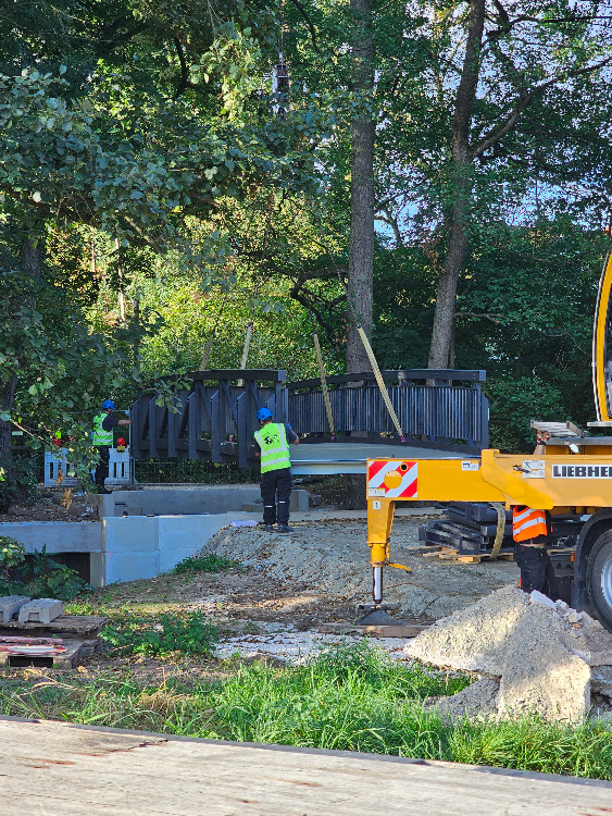 Die alte Brücke war in die Jahre gekommen und musste ersetzt werden. Beim Bau des Nachfolgers war dann Maßarbeit gefragt: Die Aluminiumkonstruktion musste ganz genau abgesenkt werden, denn ohne Kran lässt sich die 2,4 Tonnen schwere Brücke kaum bewegen. Geliefert wurde die Brücke als Fertigelement aus Baden-Württemberg. Für Halt sorgen die umfangreichen Gründungs- und Betonarbeiten, inklusive 8-Meter-Tiefengründung mit Stahlspundwänden.
