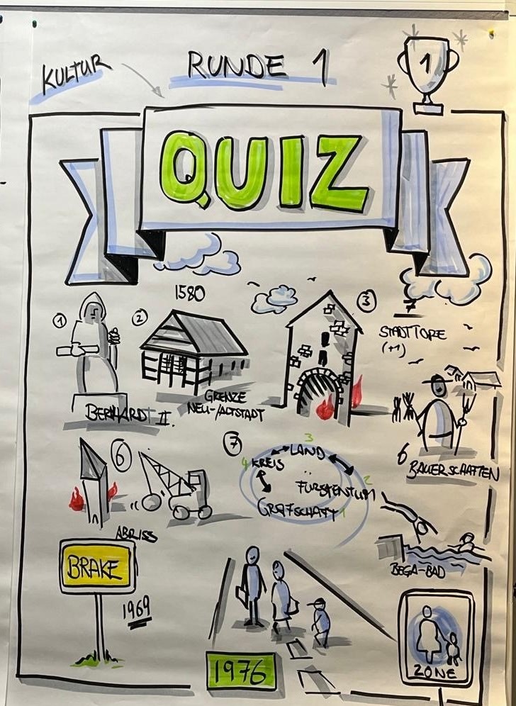 Julia Plötzgen, die Leiterin des Stadtarchivs, moderierte das Quiz. Unterstützung erhielt sie von Timo Broeker, wissenschaftlicher Mitarbeiter am Institut für Energieforschung der TH OWL in Lemgo, der den Abend in Bildern (Sketch Painting) begleitete. Die insgesamt vier gezeichneten Plakate werden bis zum Jahresende im Lesesaal des Stadtarchivs ausgestellt und können zu den Öffnungszeiten angesehen werden. Außerdem werden in Kürze Digitalisate im Internet bereitgestellt. Anschließend werden die Originale archiviert, denn schließlich ist es Aufgabe eines Archivs, aufbewahrungswürdige Ereignisse für die Ewigkeit festzuhalten.
