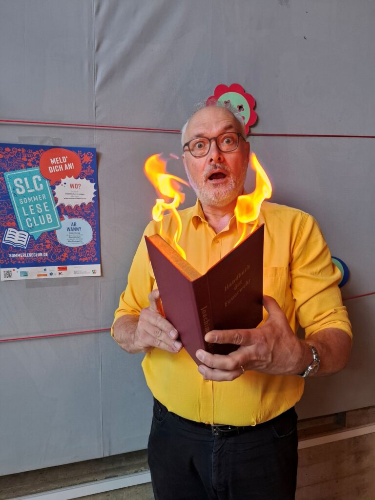 Der Sommerleseclub ist für alle Altersklassen geöffnet und so gab es bei der Abschlussfeier auch eine Wissenschaftsshow, die das große und kleine Publikum begeisterte. Als Science-Entertainer verband Joachim Hecker das Wissenswerte mit dem Unterhaltsamen. Aus Wasser machte er Schnee, die eigene Stimme im Kopf machte er hörbar und er gab Fynn die Gelegenheit, mit der Hilfe von Elektroden und Kabeln seinen Papa zumindest ein kleines bisschen nach seiner Nase tanzen zu lassen.