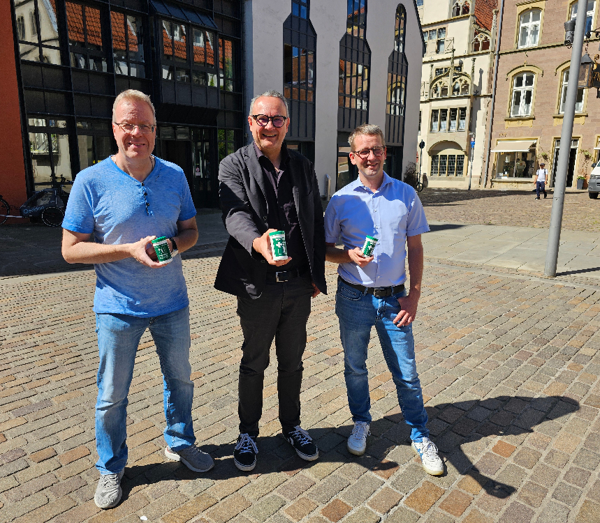 Foto: Kleine Dose, große Wirkung. (von links) Thomas Lenniger, Leiter der Abteilung Soziales, Bürgermeister Markus Baier und Dennis Ortmeier, Geschäftsführer der Stiftung Kloster St. Loyen, freuen sich über die Notfalldosen. (Foto: Alte Hansestadt Lemgo)