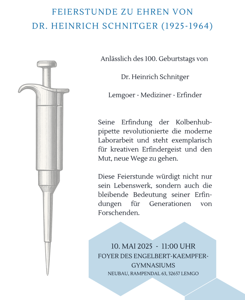 Am Samstag, den 10. Mai findet deshalb um 11 Uhr im Foyer des Engelbert-Kaempfer-Gymnasiums (Neubau) eine Feierstunde zu Ehren von Dr. Heinrich Schnitger (ehemals Schüler am EKG) statt, dem in Lemgo geborenen Mediziner und Erfinder der Kolbenhubpipette – einem Meilenstein der modernen Labortechnik.