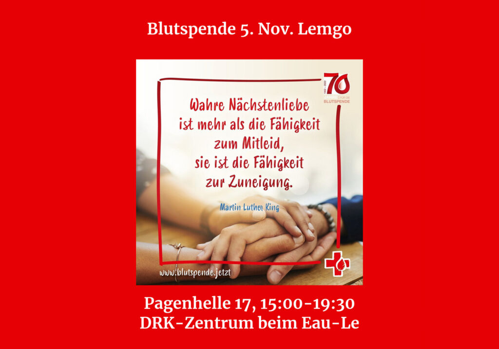 In Lemgo ist das am Mittwoch, dem 5.11.2025 in der Pagenhelle 17 möglich. Das DRK-Zentrum ist von 15:00 bis 19:30 Uhr für die Blutspende geöffnet.