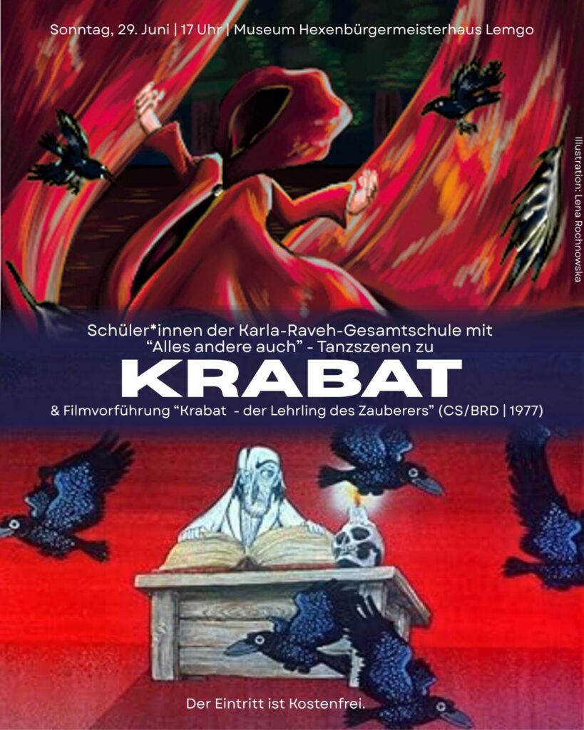 Anknüpfend an die aktuelle Sonderausstellung „Die kleine Hexe“ zeigen Schüler*innen der Karla-Raveh-Gesamtschule (unter der Leitung von Patricia Struffolino) Tanzszenen zu Otfried Preußlers „Krabat“. Die künstlerische Auseinandersetzung mit der mystischen Geschichte um den jungen Zauberlehrling, der sich mit dunklen Kräften einlässt, wird im Anschluss im Medium des Films fortgesetzt. Gezeigt werden Ausschnitte aus dem gleichnamigen Flachfiguren-Animationsfilm von 1977 des tschechoslowakischen Regisseurs Karel Zeman.