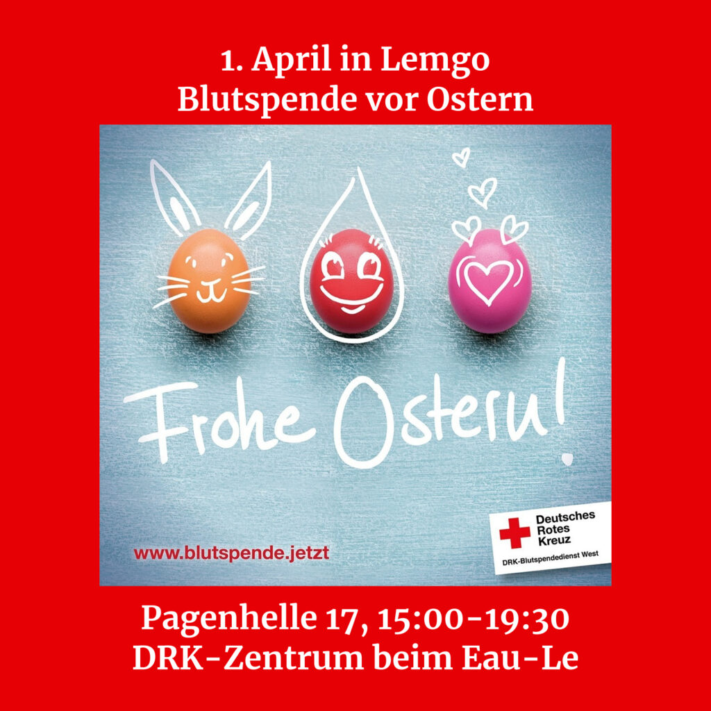 Das Deutsche Rote Kreuz lädt in Lemgo zur Blutspende ein. Gespendet werden kann am 1. April zwischen 15:00 Uhr und 19:30 Uhr im DRK-Zentrum Lemgo, Pagenhelle 17. Das DRK-Team in Lemgo sorgt für beste Verpflegung, die auch vegetarisch oder vegan sein kann.